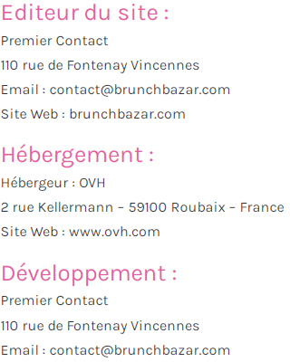 Merci de lire avec attention les différentes modalités d’utilisation du présent site avant d’y parcourir ses pages. En vous connectant sur ce site, vous acceptez sans réserve les présentes modalités. Aussi, conformément à l’article n°6 de la Loi n°2004-575 du 21 Juin 2004 pour la confiance dans l’économie numérique, les responsables du présent site www.brunchbazar.com sont :